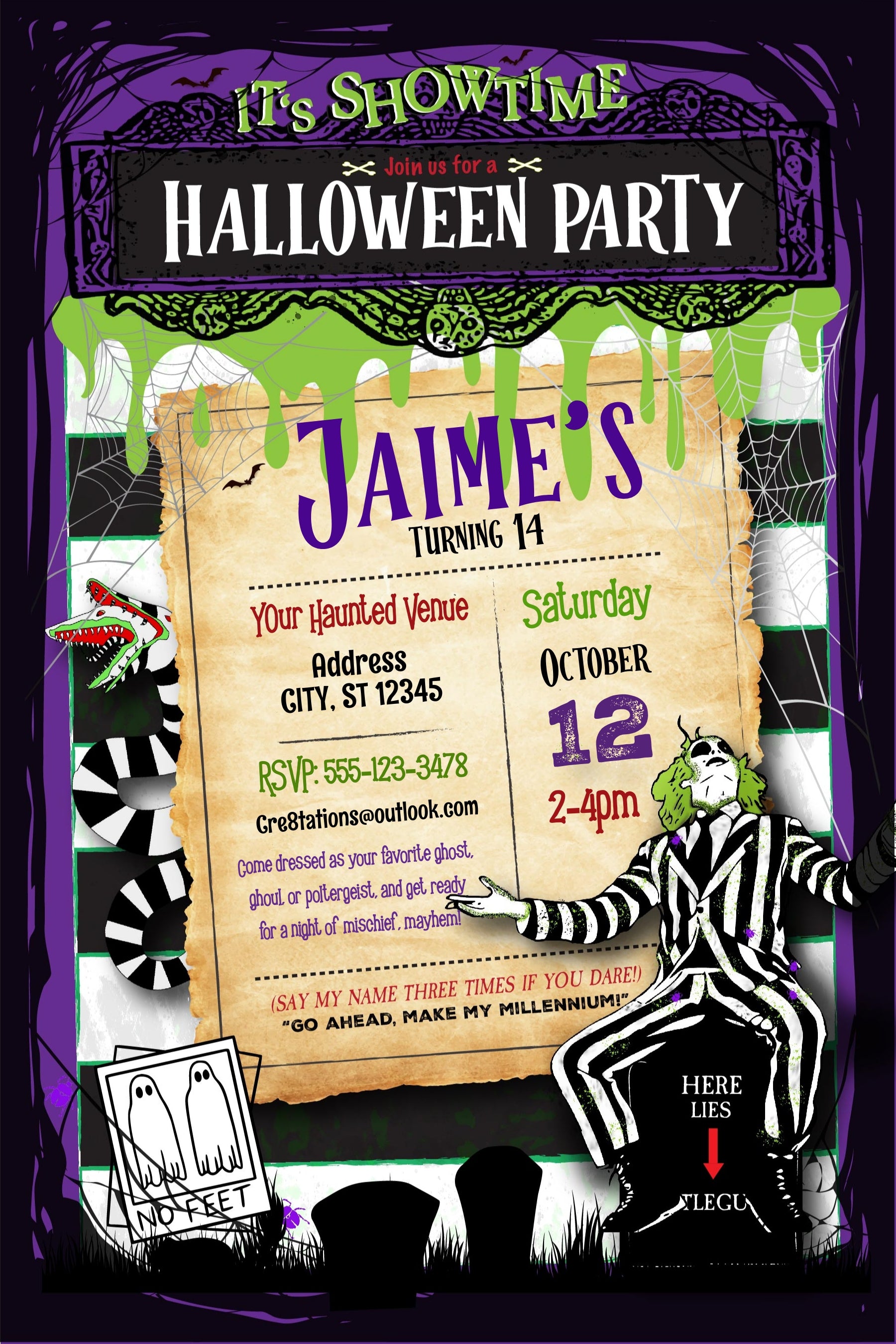 Invite the ghost with the most to your birthday bash with our Beetlejuice birthday invitation. Don't miss out on this party's cryptic fun and spooky surprises. Say his name (three times) and get ready to party like a poltergeist. Don't say we didn't warn ya!