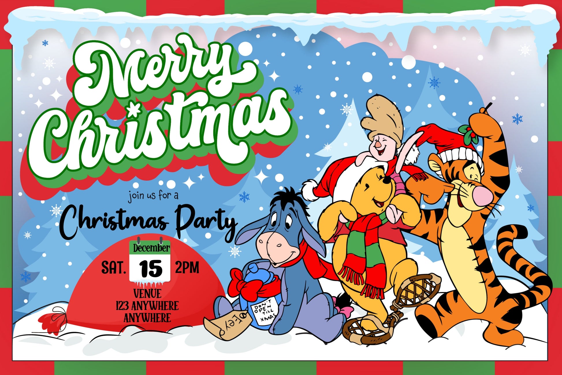 Spread holiday cheer with Winnie the Pooh's Christmas party invitation! Join Pooh bear and friends for a jolly celebration filled with gifts, treats, and fun (honey included!). Don't miss out on this festive gathering!